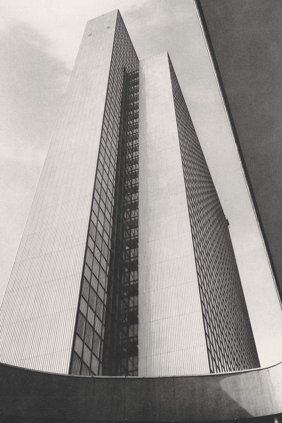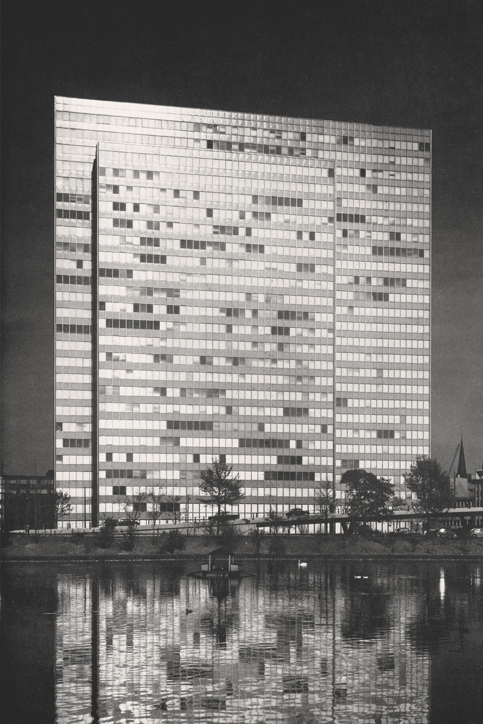 Urheber dieser „Zukunftsvision“ – die für viele als gebauter Ausdruck des westdeutschen Wirtschaftswunders galt und für den Beginn eines neuen Zeitalters in der Architektur stand – waren die Architekten Helmut Hentrich und Hubert Petschnigg (HPP). Ihr Siegerentwurf des 1955 entschiedenen Wettbewerbs gliedert den Baukörper in drei gegeneinander versetzte schmale Scheiben, von denen die mittlere mit 94 Metern und 24 Etagen die höchste ist. Das signifikante Erscheinungsbild, das dem Haus zu seinem einprägsamen Namen verhalf, schufen die Architekten, indem sie den Gebäudekern mit Aufzügen und die Sanitäranlagen dort platzierten, wo sich die drei unterschiedlich hohen Scheiben decken. Die zugehörigen Erschließungsflure gliederten sie optisch zurücktretend als „Fugen“ zwischen den Scheiben ein. Durch diese Anordnung der Erschließung sparten die Entwerfer wertvolle Verkehrsfläche ein. Die auf insgesamt 35.000 Quadratmeter verteilte modernste Bürofläche ließ sich flexibel als Großraumbüro oder Sitzungssaal nutzen oder aber zu Einzelbüros aufteilen. Neben diesen Eigenschaften war es vor allem seine Konstruktion nach Mies’schen Prinzipien, die dafür sorgte, dass das Gebäude als herausragendes Zeugnis der Nachkriegsmoderne in die Architekturgeschichte einging und den Wolkenkratzerbau der 1960er und 70er Jahre in den USA mitprägen konnte. Für die Architekten war der Skelettbau mit den Stirnseiten aus Edelstahl und der betont einfachen Vorhangfassade aus Stahl, Aluminium und Glas eines der ersten Hochhausprojekte, auf die viele folgen sollten.